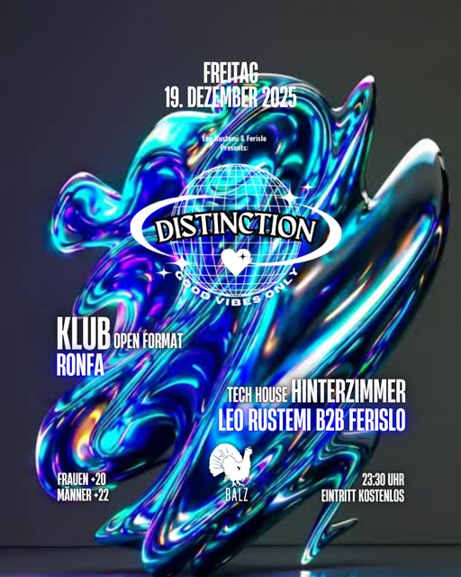 Distinction bringt diesen besonderen Dezember-Glow in den Balz: eine Nacht, die sich komplett um gute Vibes, Leichtigkeit und dieses „alles fühlt sich irgendwie ein bisschen futuristisch an“-Gefühl dreht.